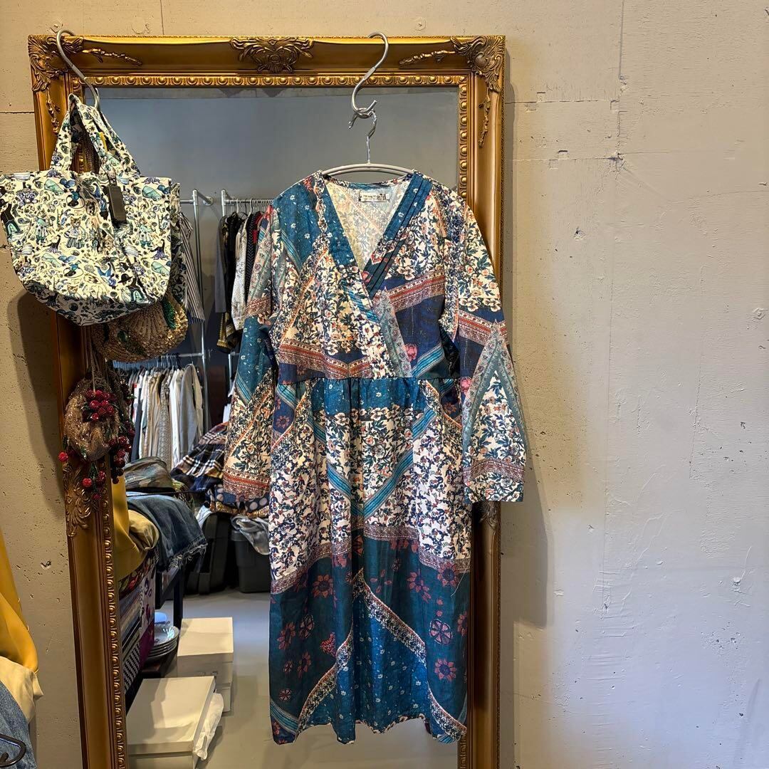 @ 花柄 ワンピース シャツ ロング エスニック Vネック