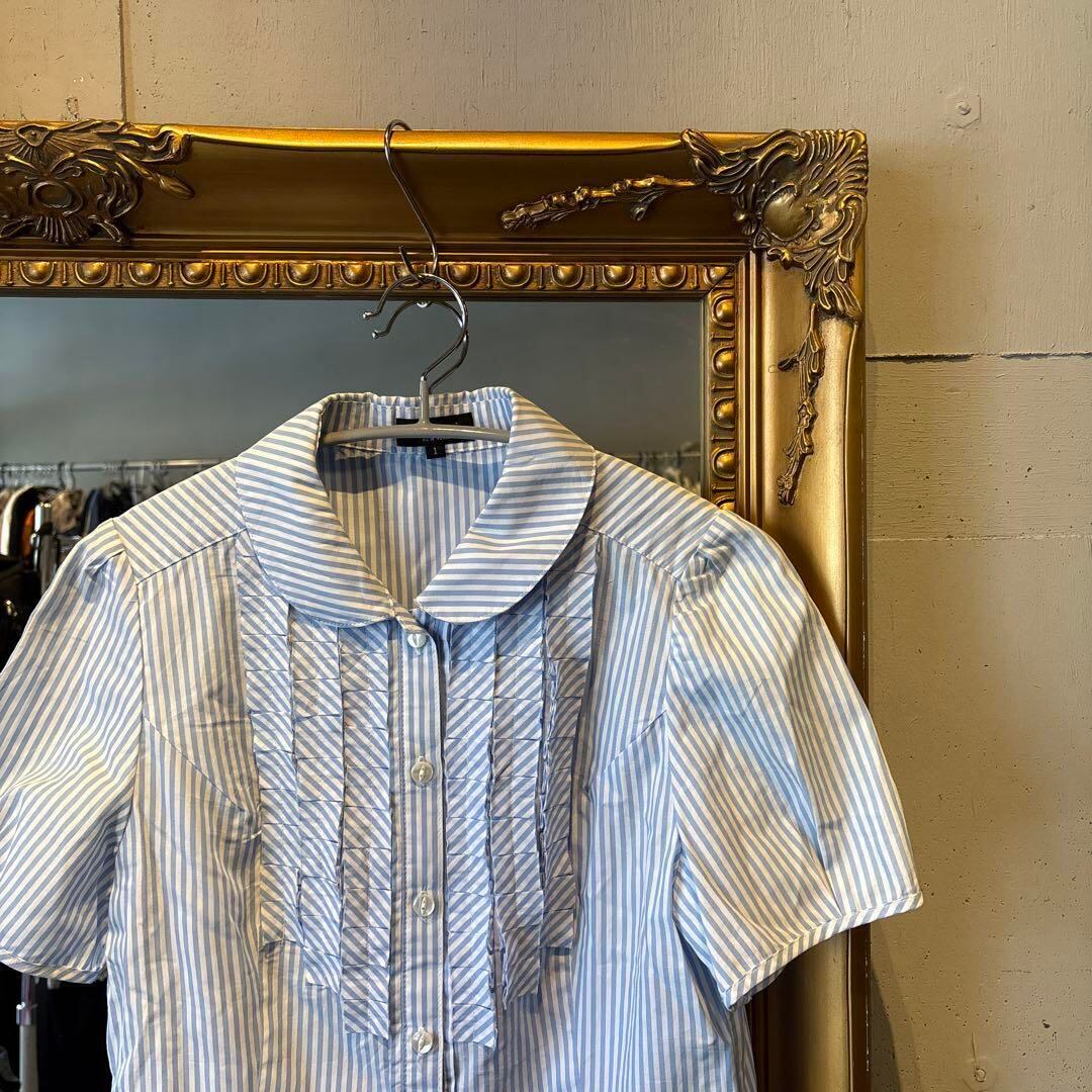 @ 丸襟 フリル ストライプ 総柄 ブラウス シャツ トップス 半袖