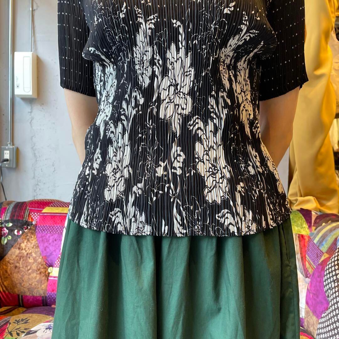 @ 花柄 総柄 ブラウス シャツ プリーツ 可愛い ストレッチ レトロ 白黒