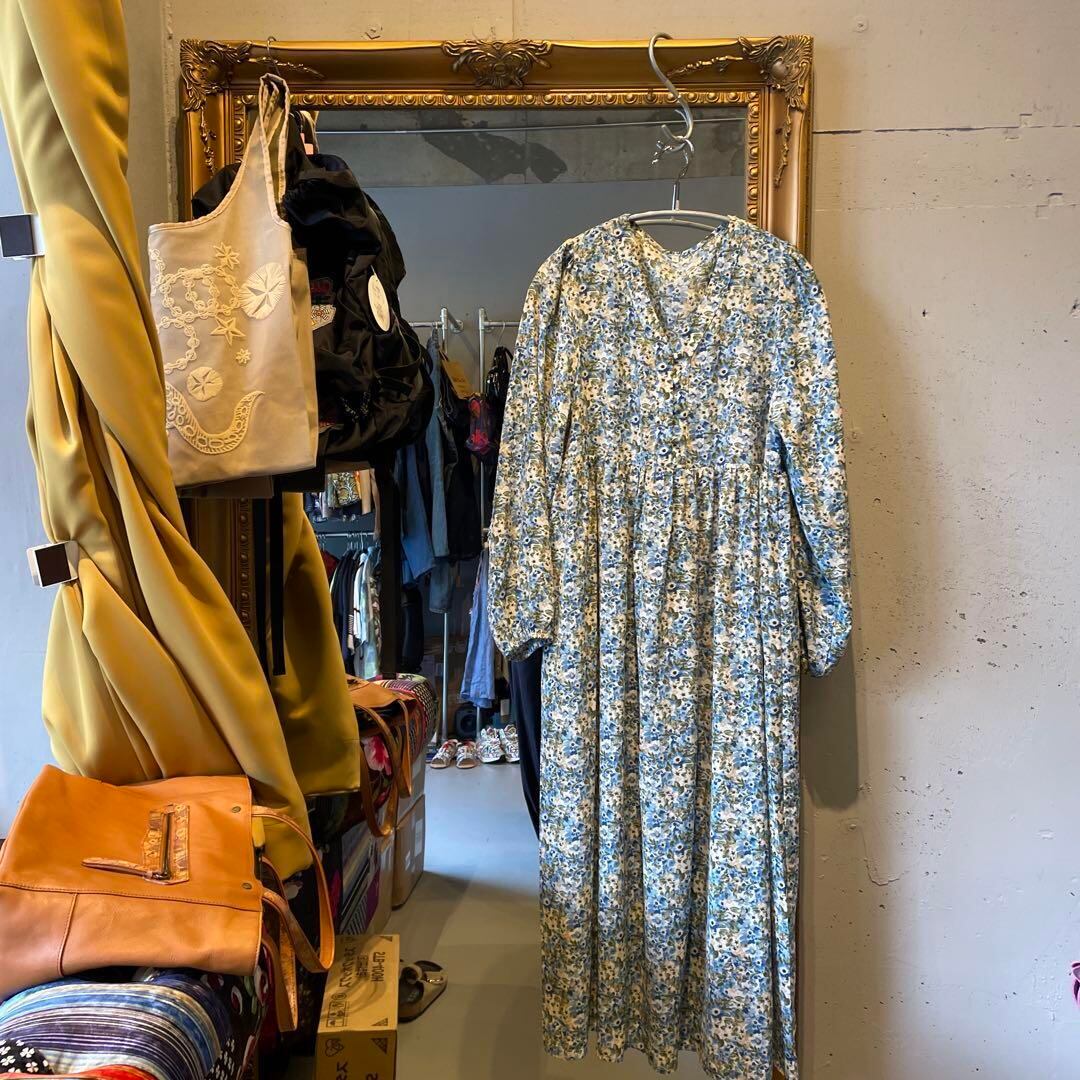 @ 花柄 フラワー ワンピース シャツ ロング マキシ ブルー 水色