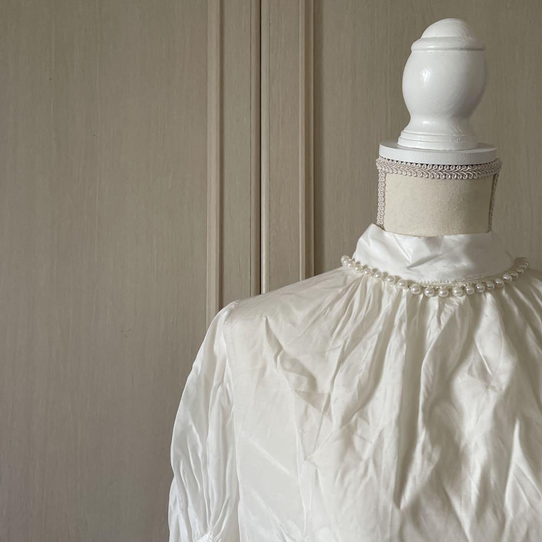W リボンパールブラウス ホワイト 白 ハイネック シャツ トップス