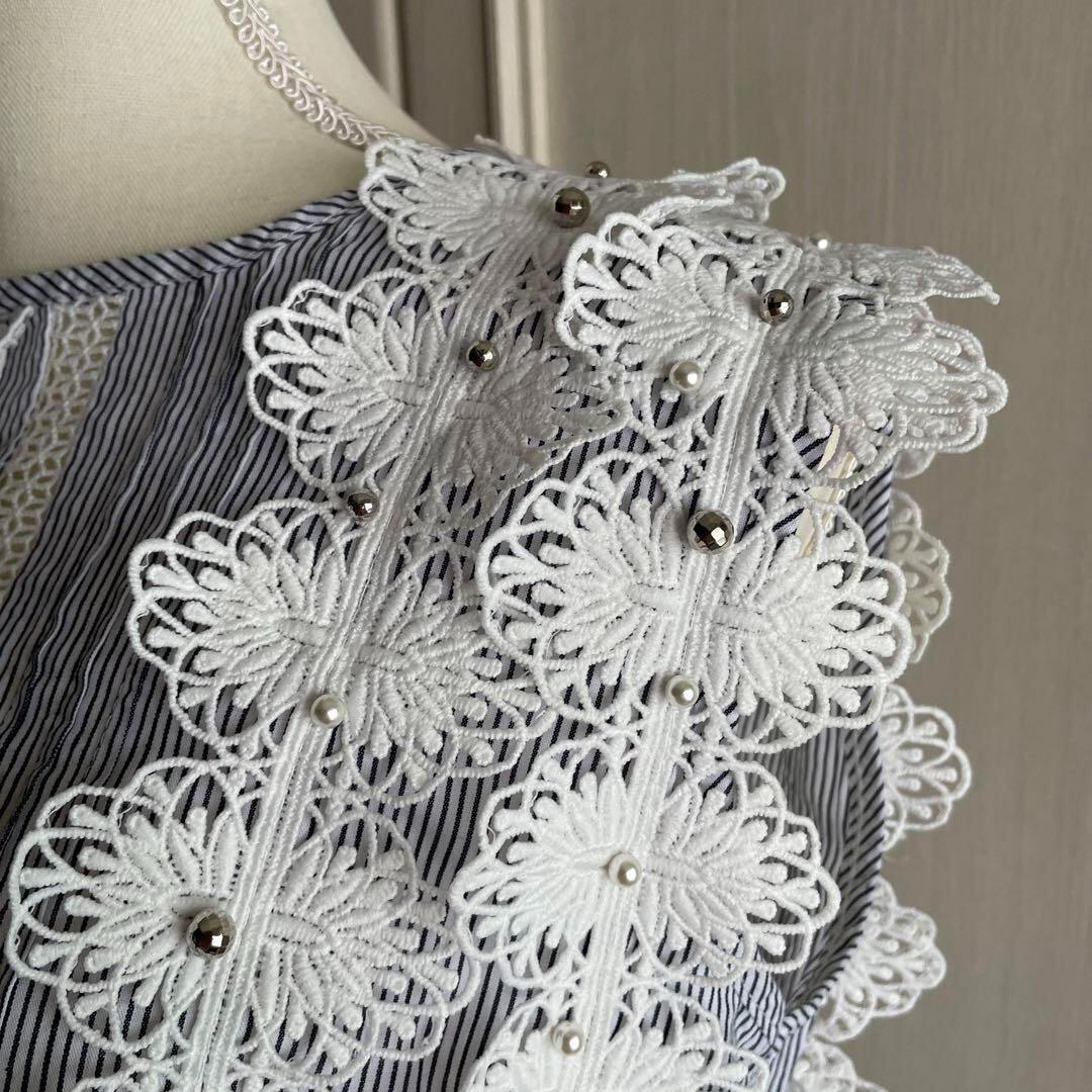Y 韓流 花柄 ストライプ 刺繍 レース ブラウス シャツ トップス 青 白