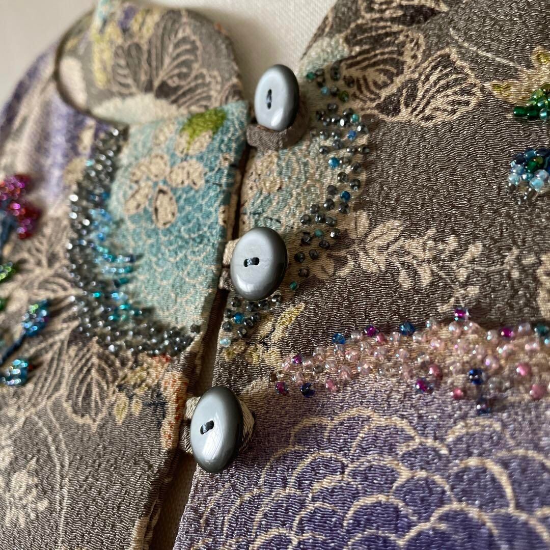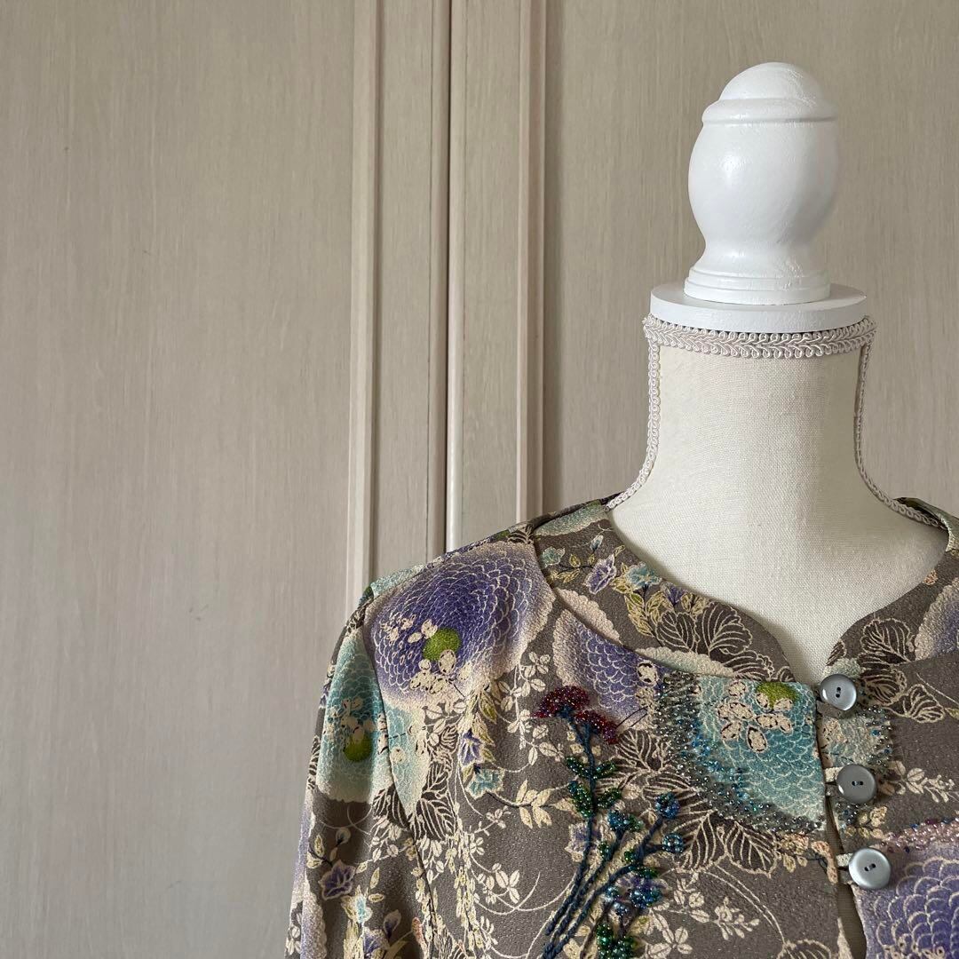 72 キモノ 着物 リメイク ビーズ 刺繍 花柄 ブラウス シャツ トップス