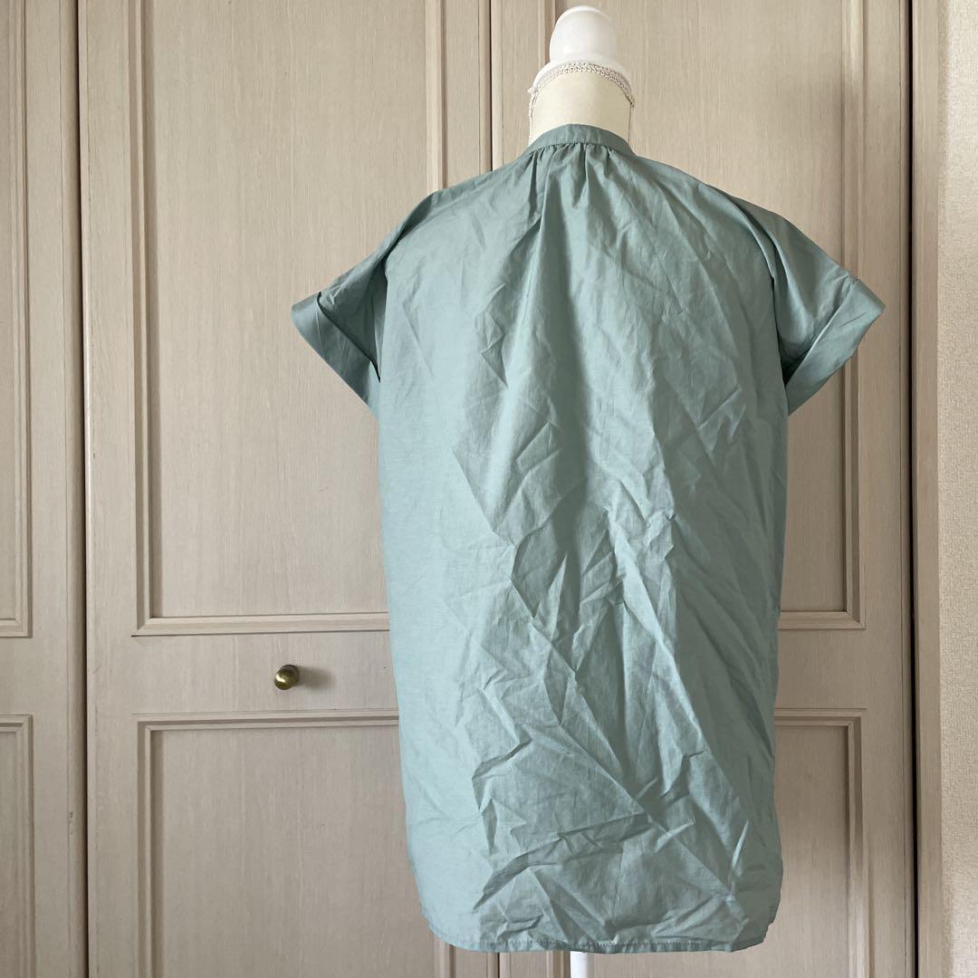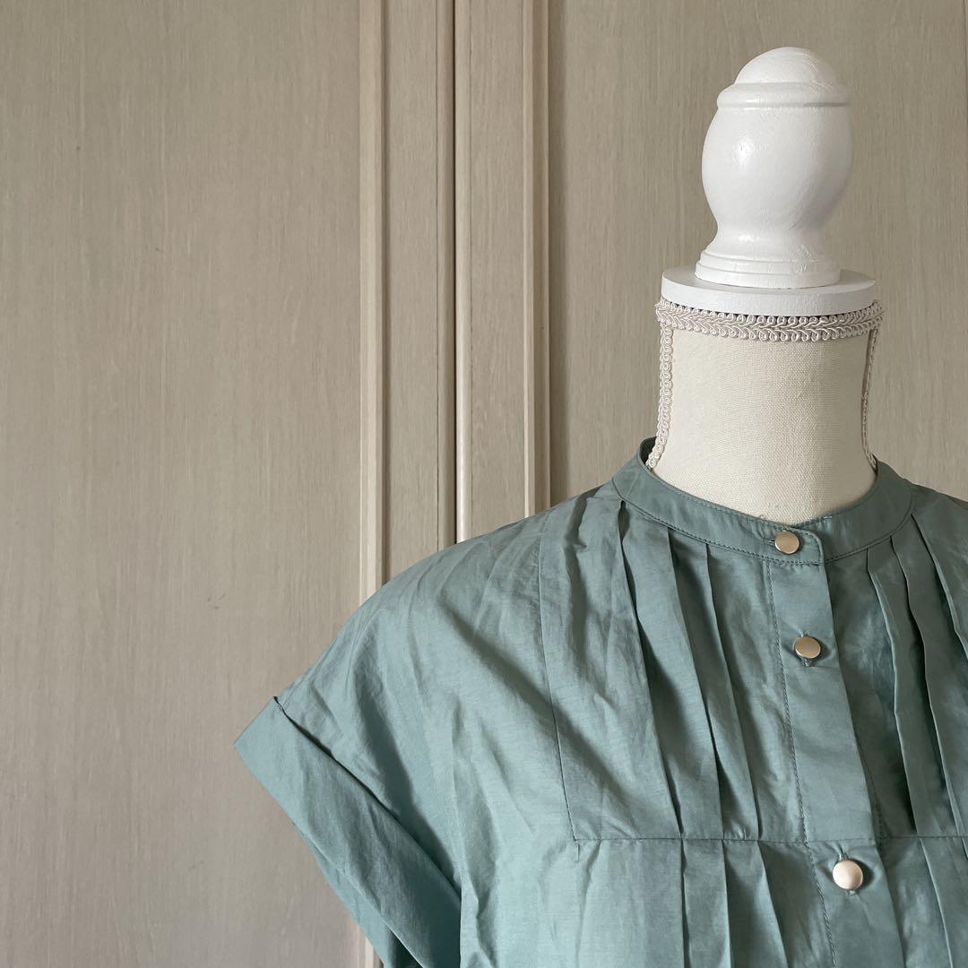72 ピンタック ブラウス シャツ トップス 半袖 ブルー 無地 金ボタン