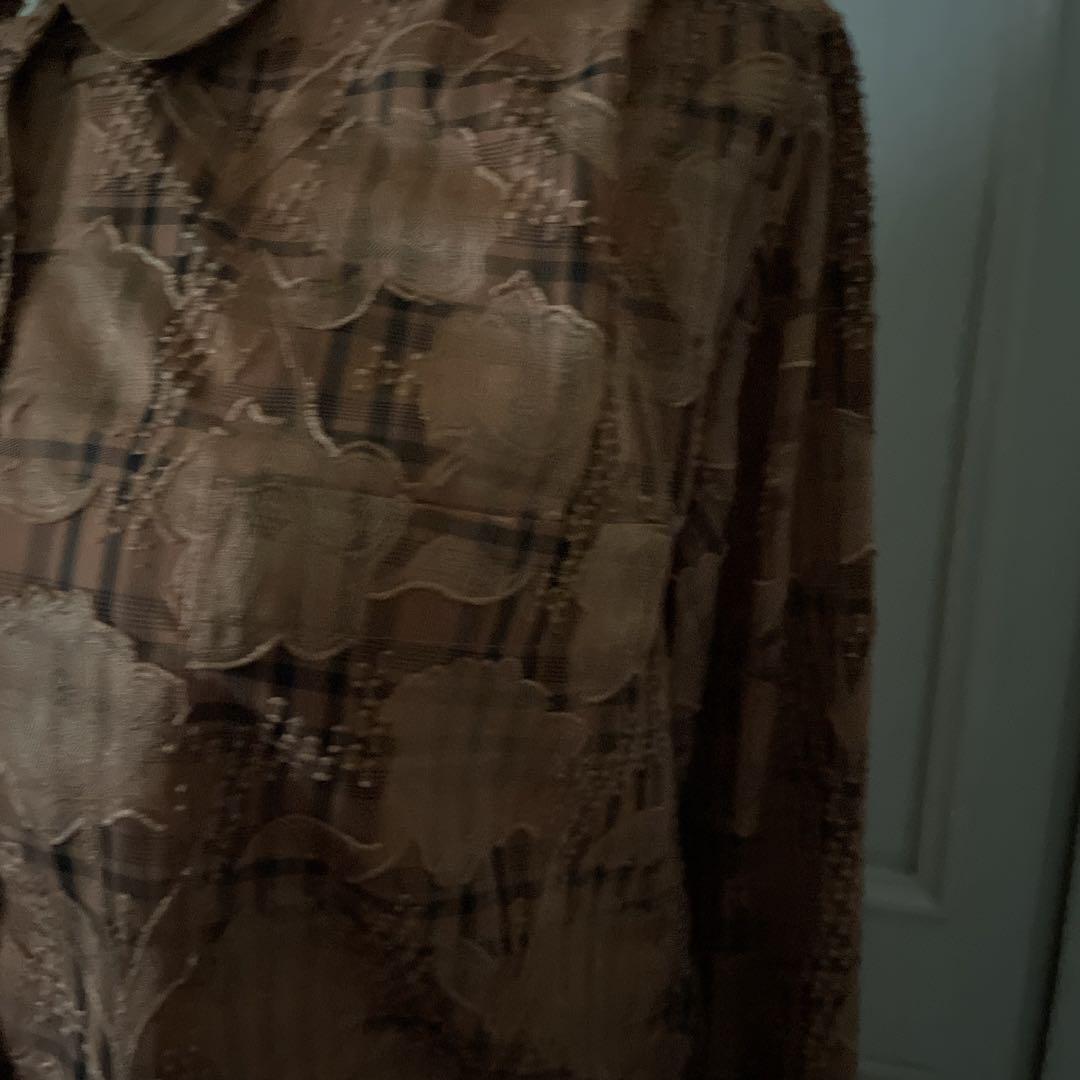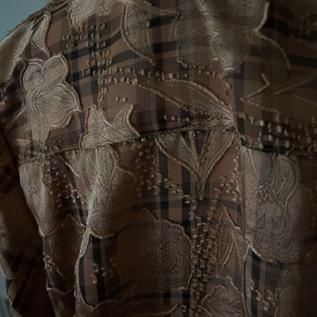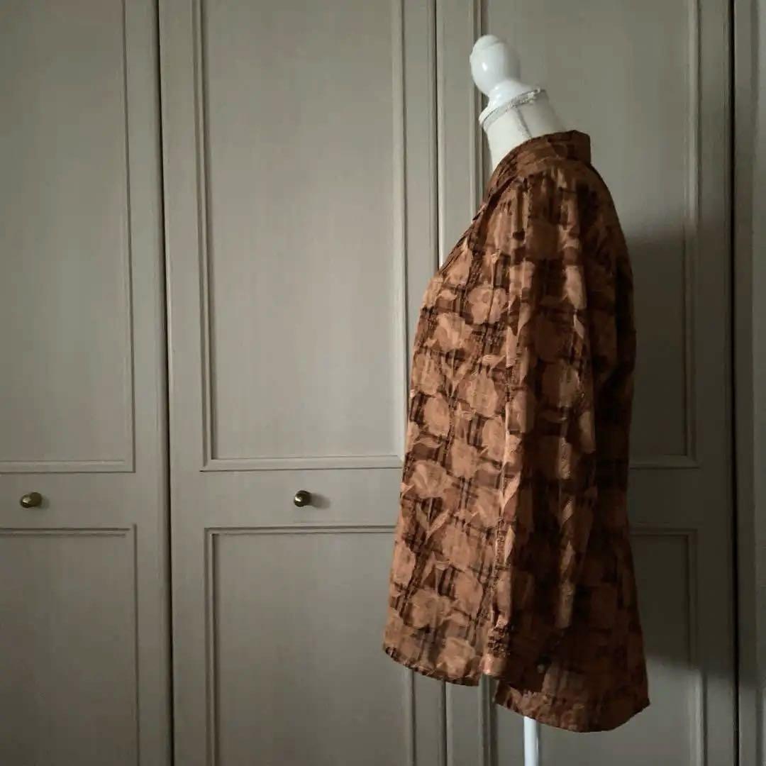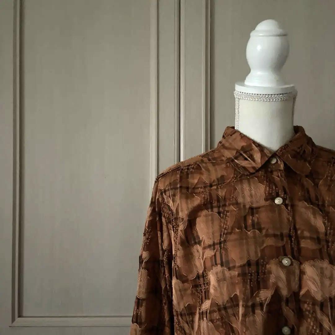 - レトロ 長袖 花柄 刺繍 ブラウス シャツ 茶色 トップス チェック