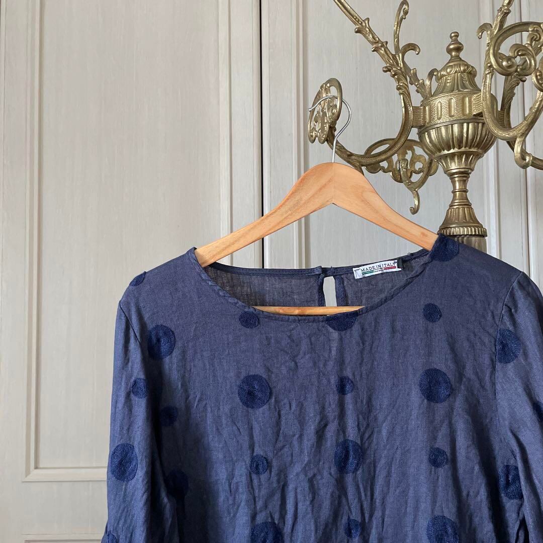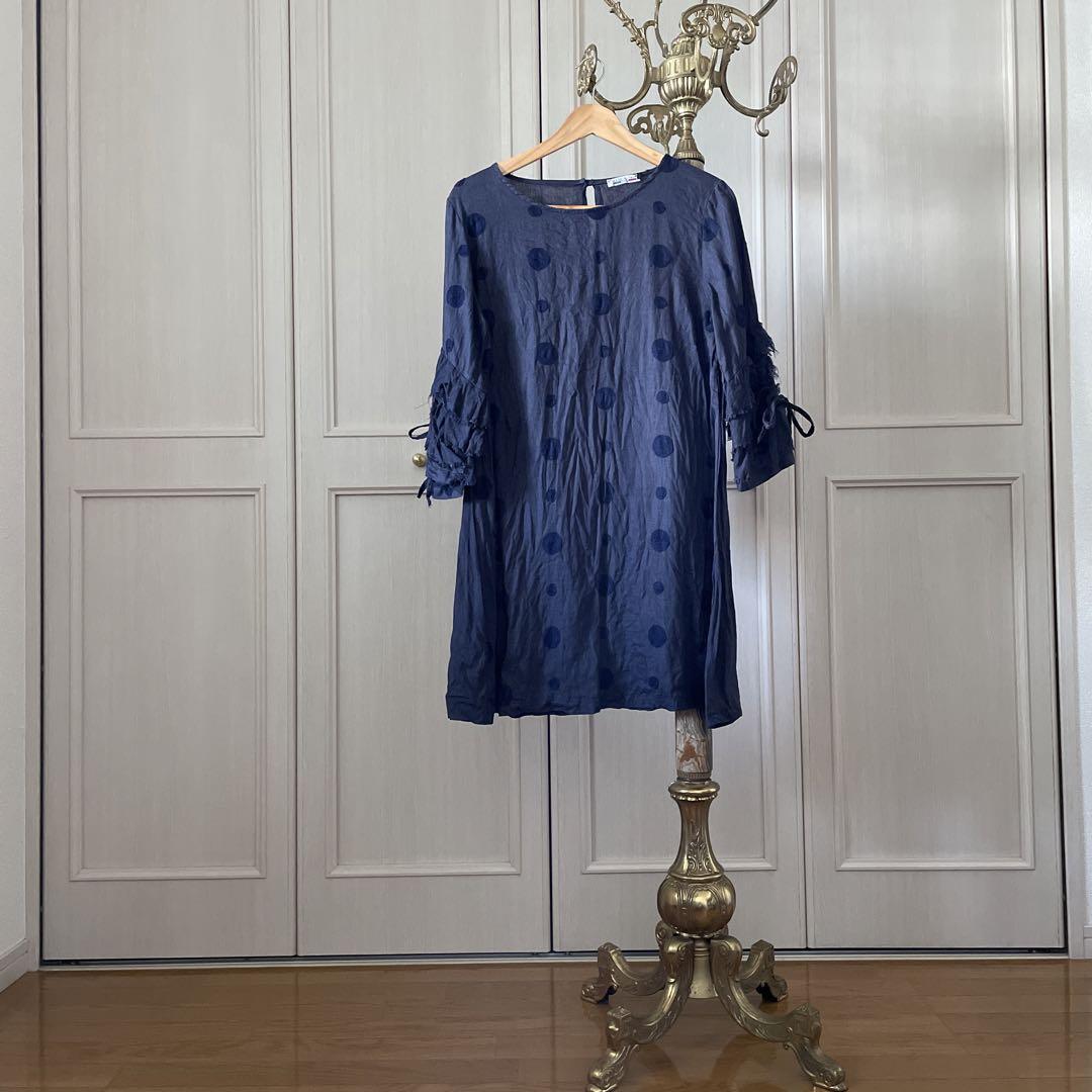 7 ドット 水玉 刺繍 リネン ワンピース 麻 ロング フリル