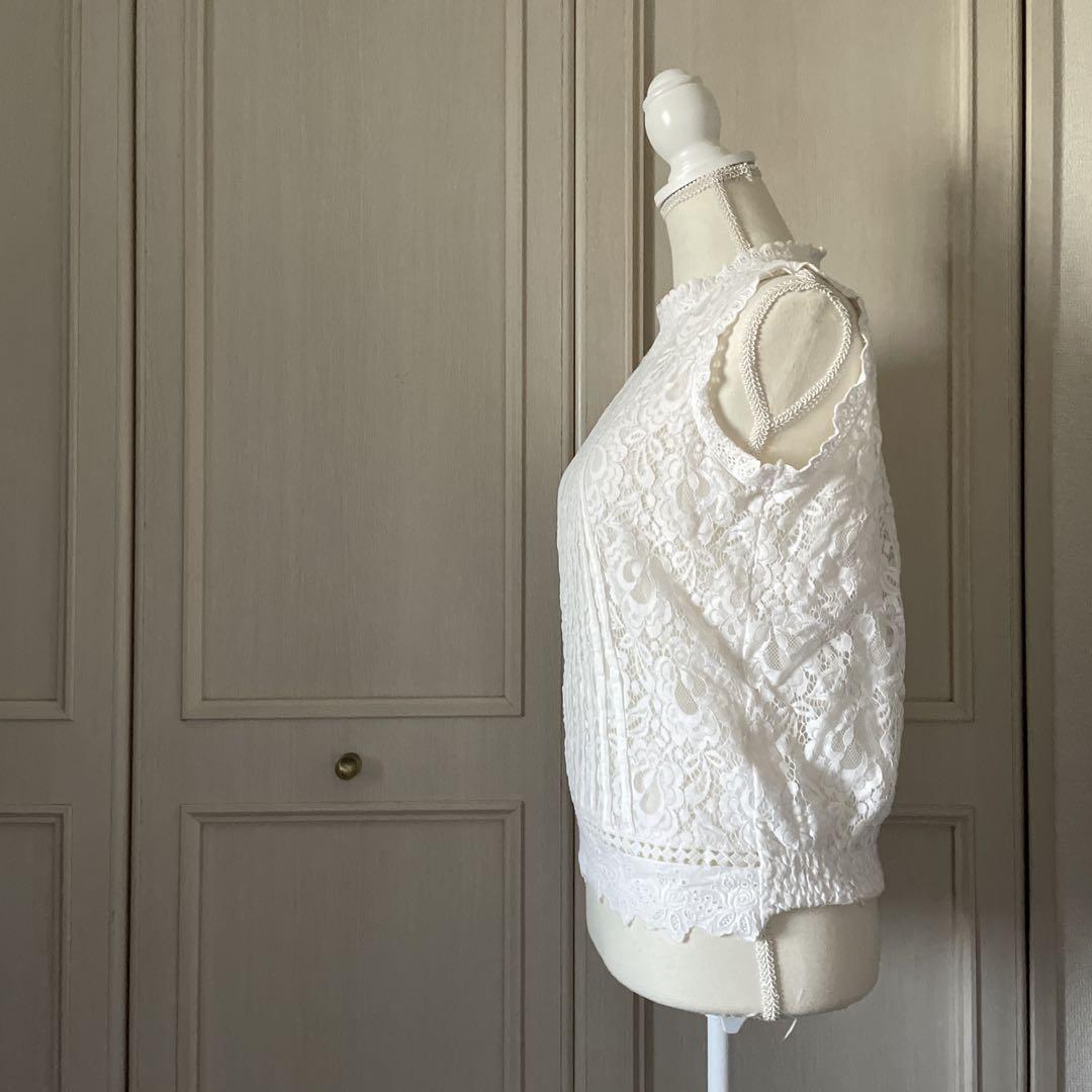 54 レース ハイネック ブラウス シャツ トップス 花柄 フリル 白 ホワイト