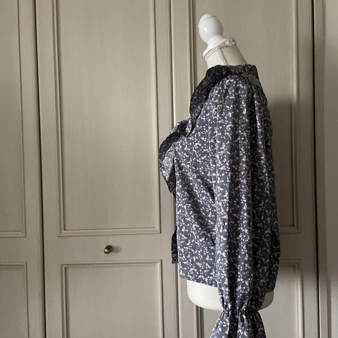 48 花柄 総柄 フリル 長袖 青 バンドカラー ブラウス シャツ トップス